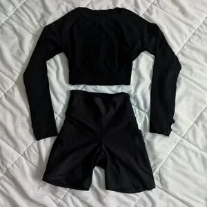 Elevate your workout wardrobe with this sleek black long sleeve crop top and shorts. Designed for comfort and style, it's perfect for any active lifestyle.