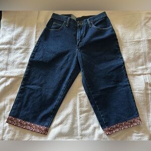 Stylish women's blue denim capri pant featuring a charming floral trim. Perfect for casual outings. Add a touch of elegance to your wardrobe. NWT