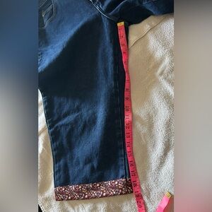 Stylish women's blue denim capri pant featuring a charming floral trim. Perfect for casual outings. Add a touch of elegance to your wardrobe. NWT