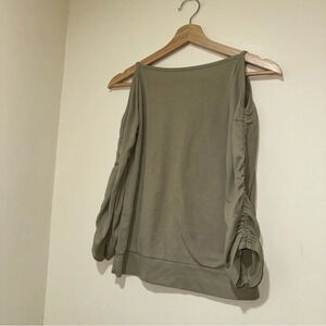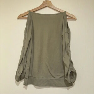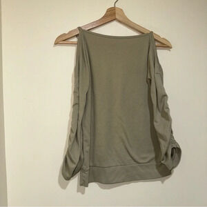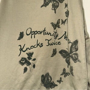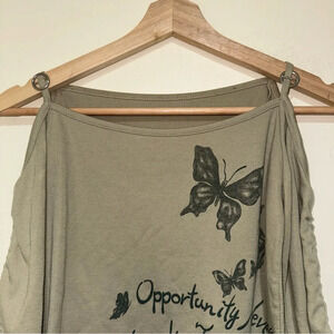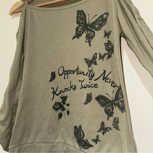 Women’s Y2K Miss Green O-Ring Long Sleeve Butterfly Graphic With Ruffle Sleeves. No size or material tag. In preowned condition as seen in photos. Butterfly graphic still has glitter. One o-ring is flipped the over way as seen in photos. Guessing it is a size s-m based on measurements. Measurements included in photos.