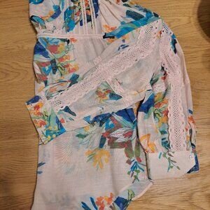 Floral V Neck blouse with crochet detail on the front of blouse and the arms, cuffed sleeves, gently worn but in excellent condition, size large, 65% Rayon, 35% Polyester, crochet detail 100% Cotton, hand wash. Pit to pit 22 inches.