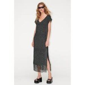 Women's Zara Knit Midi Metallic Black Silver V-Neck Dress Fringe Bottom Size S