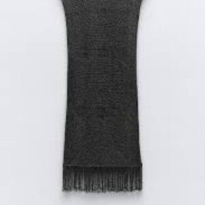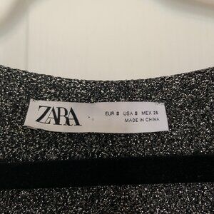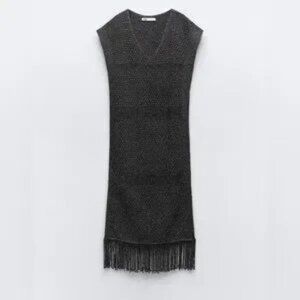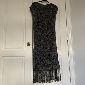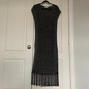 Women's Zara Knit Midi Metallic Black Silver V-Neck Dress Fringe Bottom Size S