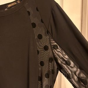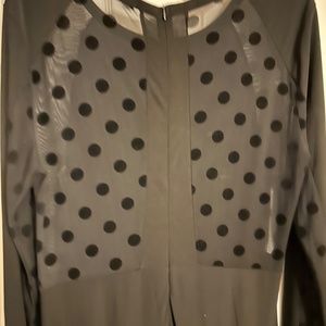 Black gown with mesh and polka dot long sleeves, back and cut out legs. Dress is stretchy but elegant. Fits size 14/16. Long length for a tall woman.