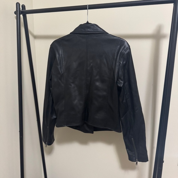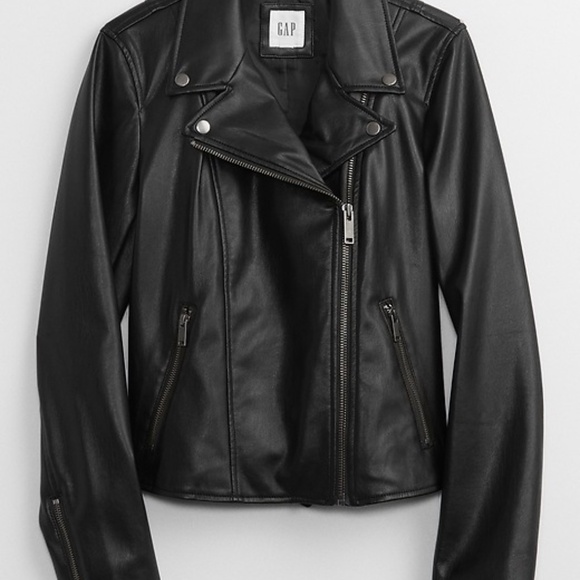 Size small black faux leather jacket from the Gap. Fitted and a bit cropped. Gunmetal detailing on zippers and buttons. There are buttons to hold down the collar when unzipped which is a nice detail! The faux leather feels soft and good quality. Approx length measures about 21”.