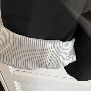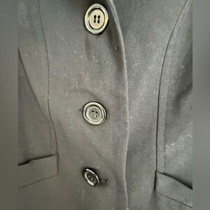 Beautiful classic black blazer. 3 buttons on front. Beautiful pinstripe liner which can be shown at the wrist when turned up.