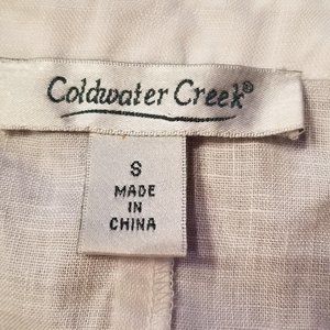 White blouse from Coldwater Creek line. 3/4 length sleeves and deep, rounded neckline with small ruffles at neck and sleeves. This blouse is fairly fitted. 100% linen, with what appears to be abalone shell buttons No stains or tears.