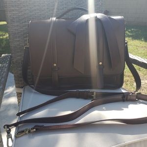A chocolate brown briefcase that comes with a second strap to turn it into a backpack. It has a detachable bow as well. It has 7 compartments including the main storage area, a zipped up compartment, 3 smaller compartments, a compartment in the front as well as a space for your ipad or laptop. It's in great condition and lightly used. I think it's an adorable bag however just not my style anymore. :)