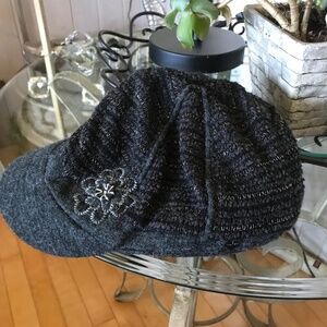 This is a fun fall cap with silver stitching throughout the top. There is also a button to the side with the same silver thread. Sorry no tag so brand unknown.