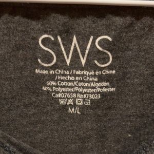Women’s cropped dark grey T-shirt, it is rolled up on both sides of the arms and has an image on the front that says “love is infinite”. It is size M/L