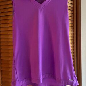 Sweet shirt - v neck - all business in the front but a party at the back with cute pleat row! Sleeveless with collar. Deep purple .91%poly and 6% spandex. Never worn!!! Great for tennis/ golf or just casual daily wear - also great collar for under a sweater. Made by Mondetta with small metal logo sewn on bottom left side.
