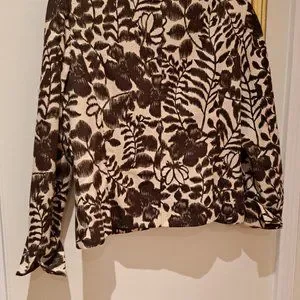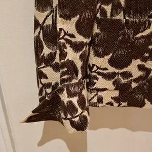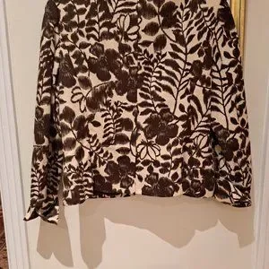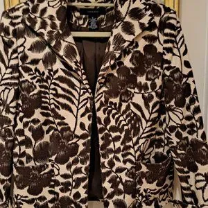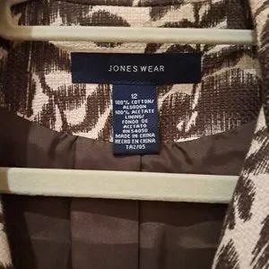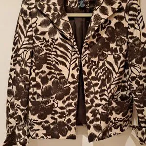 Jones wear jacket size 12, 100% cotton side pockets front hook closer ,length from shoulder down 23" bust closed about 40" very clean worn only once color floral print brown/beige
