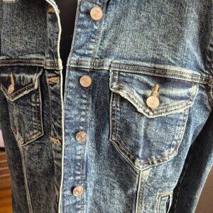 This classic denim jacket is the perfect addition to any wardrobe! It features a timeless design with a button-down front, two chest pockets, and adjustable cuffs for a custom fit. The jacket is in excellent condition, with a slightly faded wash that gives it a relaxed, lived-in look. Its versatile style pairs effortlessly with everything from casual tees to dresses, making it a go-to layering piece for year-round wear. Whether you're dressing it up or keeping it casual, this denim jacket is sure to elevate any outfit!