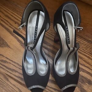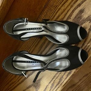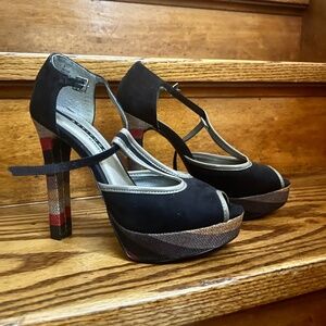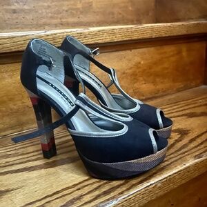 Beautiful black suede with grey leather trim and color block heels. Size 6, women’s shoes. 5 inch heels. Worn only once but too small for me. Sturdy and well made. In excellent condition.