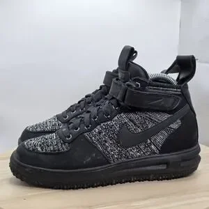 The product is a pair of women's size 7.5 Nike Lunar Force 1 Flyknit shoes in a black and white Oreo colorway. These lace-up sneakers feature a standard shoe width and an ankle strap for added support. The upper material is made of Flyknit, known for its lightweight and breathable design. The Nike Flyknit product line ensures high quality and style, making these shoes a comfortable and fashionable choice for women looking for a blend of performance and aesthetics.