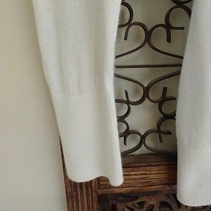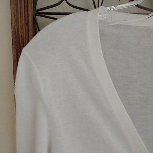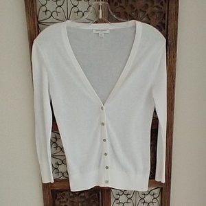 Women's size XS white button-up cardigan. Excellent condition, worn twice, no marks or flaws. 100% cotton - light material, great for spring / summer. Design highlight: gold buttons for an elegant look. Measurements: armpit to sleeve length = 14", straight down side from armpit to hem length = 15", top of shoulder to hem length = 22.25", when buttoned up, length from opening above top button to hem = 12.25", length from top of sweater (ie top of back of neck) to hem = 23.25".