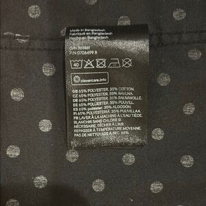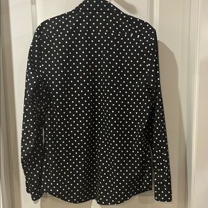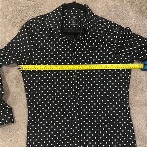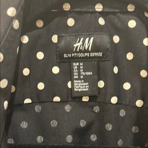 This women’s size medium H&M blazer showcases a chic black base adorned with white polka dots, offering a tailored fit and classic lapel design. The structured fabric and open-front style make it a versatile piece for various occasions.