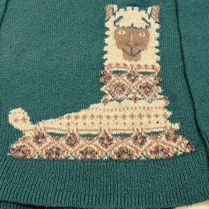 Stay cozy and stylish with this charming teal sweater featuring a playful alpaca design. Perfect for adding a touch of fun to your wardrobe.