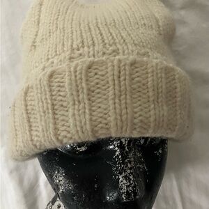 Keep your head / child warm with this cozy natural cream knit teddy bear beanie. Lovely fleece lining keeps it warm, but not itchy. Perfect for chilly days. Made by Canadian luxury & stylish hat designer DeLux. Perfect for a cold winter or spring day. Made in Nepal, dry, clean or gently wash my hand in cold water. Good used condition. 22” inside diameter