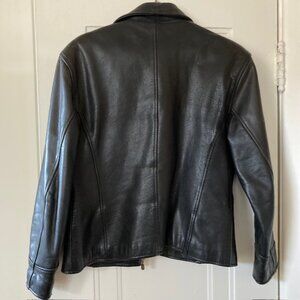 Hard to find model. A classic, simple look that will never get old. Small size, women's black leather jacket. Slash pockets, zip breast pocket (no inside pocket), perfectly proportioned collar that can be popped. Heavy leather. Zip front (no fumbling with buttons in the cold. Lining is intact, no tears. Beautifully broken in but not showing signs of heavy use. A well-cared for garment. Can be layered with a light sweater. Message for details if you need. If you know Esprit, you know the quality, and the fact that these are now sought after.