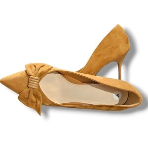 NWOT size 9 tan suede shoes with decorative bow on front stylized heel SURPRISE GIFT WITH EVERY ORDER!