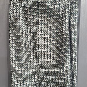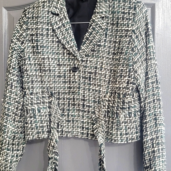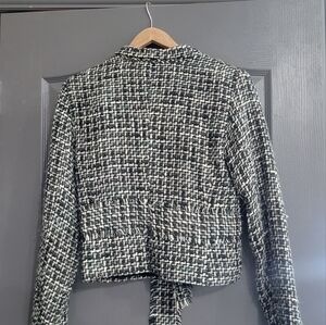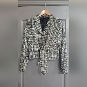Women's suit. Black, teal and white. Tessuti. Jacket with ties and skirt