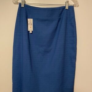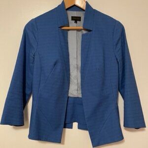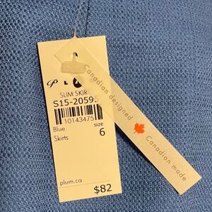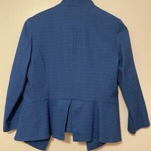 Size 6 blazer and pencil skirt set. Beautifully textured cotton, well-tailored, both pieces fully lined. The blazer has a poplin detail around the back and 3/4 length sleeves. Blazer was only worn twice for photos only; the skirt was never worn and still has tags. Designed and made in Canada.