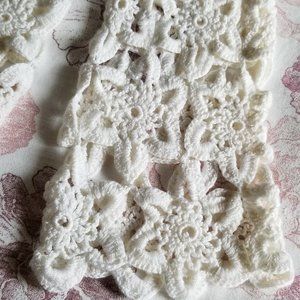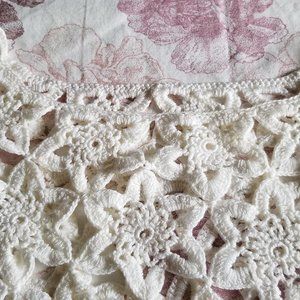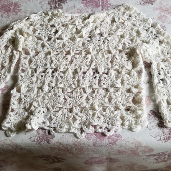 Handcrafted crochet top in white. Open weave, 3/4 length sleeves. Great over swimsuit or other solid coloured top. Good condition.