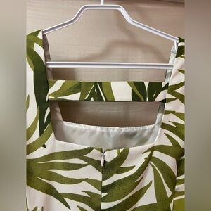 Women's size 10 sleeveless dress. Features a square neckline, YES it has pockets, and a tropical leaf print. Made of 97% polyester and 3% spandex.