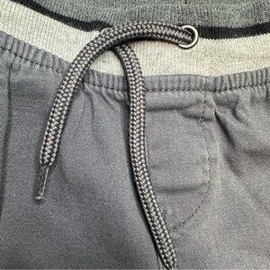 Charcoal grey cargo shorts with drawstring waist. Features multiple pockets. Ideal for casual wear.