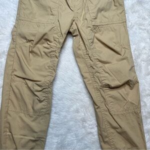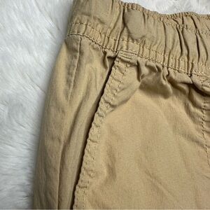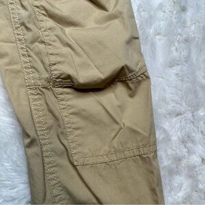 These tan cargo pants feature a relaxed fit with an elastic waistband and cuffs with an adjustable waist, offering both comfort and style. Made from lightweight fabric, they are perfect for casual outings and everyday wear.