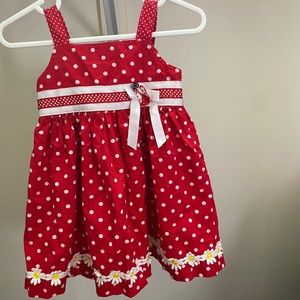 Toddler Polka Dots Sleeveless Button up Red Bow at the back White ribbon with design on the front Preowned, Excellent