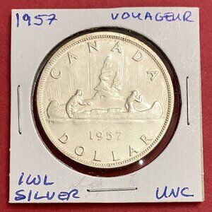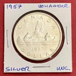 Here is wonderful pair of uncirculated 1957 Canada silver $1 coins. Made of 80% silver, these coins were manufactured in Canada. A valuable addition to any coin collection, these coins are a piece of Canadian history and a great investment for any numismatic enthusiast.