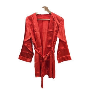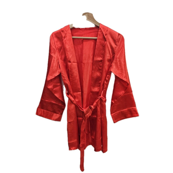 This item is a women's short satin robe with a tie belt, often referred to as a kimono or a dressing gown. It is a popular piece of loungewear or lingerie, commonly used as sleepwear or as a cover-up for special occasions like bridal showers and spa parties.