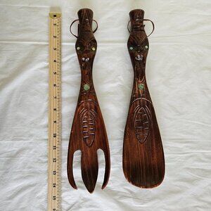 Vintage Tribal Maori New Zealand 80s 2 wood carved salad serving spoons.