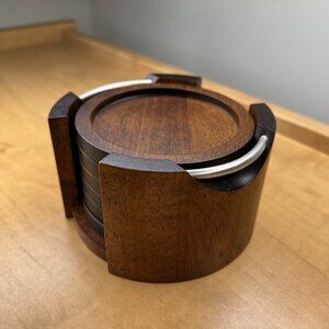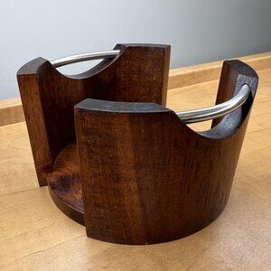 Comes with holder as pictured. Dimensions: D: 3.75" (Coaster), D: 4.5" (Holder) Condition: Very good Material: Wood