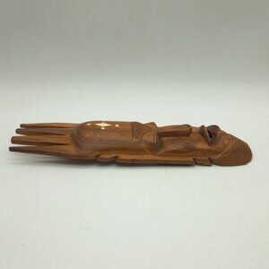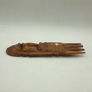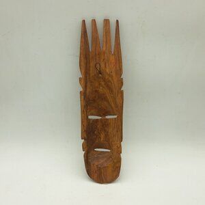 A wooden tribal wall mask made in Indonesia. It wears a decorative headdress with a diamond and dot pattern along with ritual scarring and a beard.