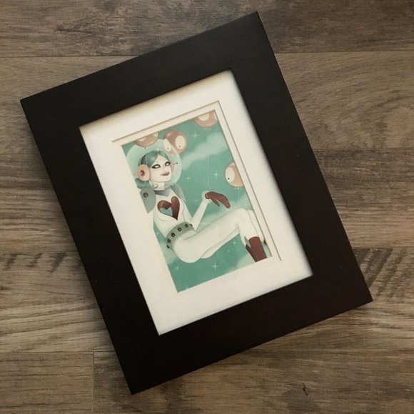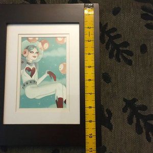 Very good preowned condition desk frame made of glass with wood frame and mounting. Modern and contemporary look. Can be hung both vertically and horizontally or set on a table. There are a few nicks on the right side (please refer to photo), but otherwise in very good condition. Includes a couple promo postcards and prints, including one by Tara McPherson.