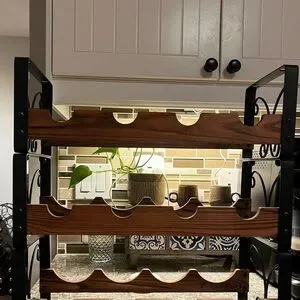 Stylish wine rack with wood and metal design. Holds 12 bottles. Perfect for kitchen or dining area. Like new condition.