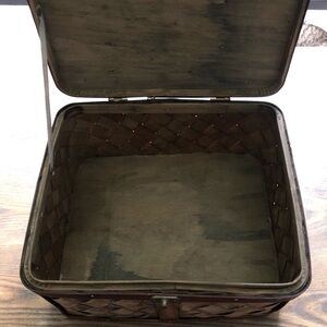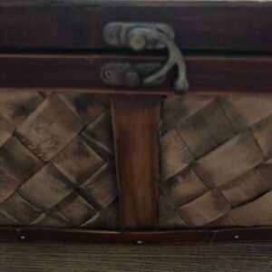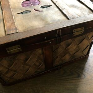Box is wood with clasp for closing, apple detail and braided wood details. Great for storing jewellery and other items. Farmhouse decor.