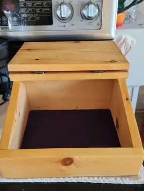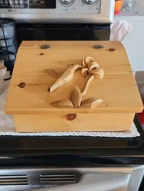 Nice wooden box with hummingbird and flower in 3d on top. Opens to nice storage area. Hinges are a bit loose but opens easily