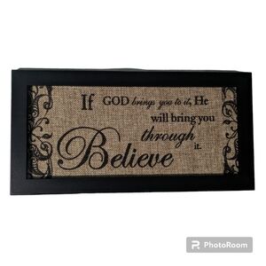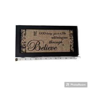 Wooden Burlap Frame Wall Decor. Pre-owned, minor flaw on top right -see pictures. Other than, great condition. Please see pictures for dimension, size and other details. #wall decor. #christian. #burlap