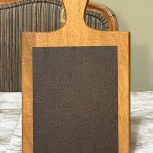 Wooden cutting board with a black chalkboard surface. Perfect for kitchen decor or serving.