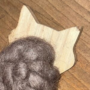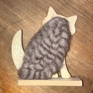 Charming wooden fox figurine with a brown wool body. Features a natural wood finish and white facial details. These figurines are sold out in new stores