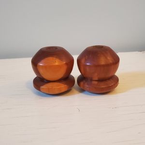 Handmade in Geneseo, New York State. Home of one of the most Premier Art Schools in America since 1871. Carved wooden Salt + Pepper shakers show normal aging with a few visible marks as seen in pictures. Unique Vintage