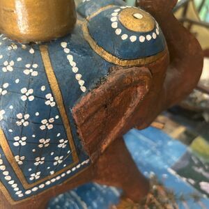 Enhance your home decor with this exquisite handcrafted brown elephant figurine. Featuring intricate blue and gold accents, this piece adds a touch of elegance to any space. 8.5" x 10"