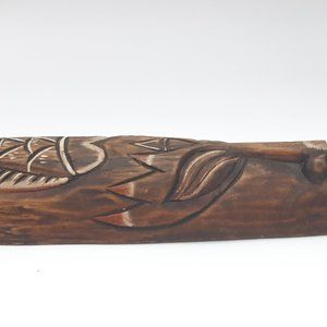 A wooden Indonesian tribal wall mask meant as a wall hanging. The forehead has a large fish while the eyes have red tipped flames coming out of them. There is wear as in the pictures.