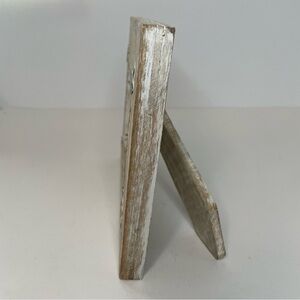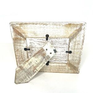 Wooden distressed frame with rusted metal accents. Has glass in picture opening. Neutral colours.