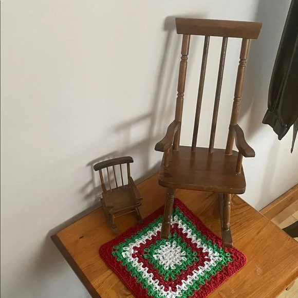Charming wooden rocking chair set. Perfect for decor or play. Rich brown finish.