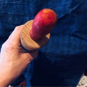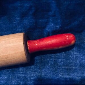 Classic wooden rolling pin. Features vibrant red handles. Perfect for baking enthusiasts. Although used, this rolling pins has years of rolling left to do. I love my old heavy rolling pin, rolling pins are not like they used to be. This rolling pin is waiting for its new owner, it is impatient to start rolling pie pastry. Check pics over